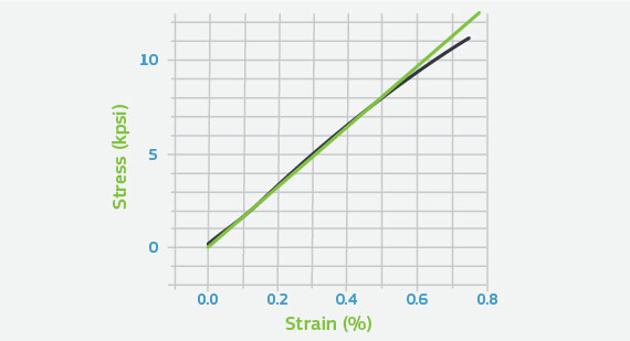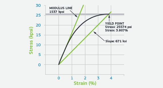 Modulus is provided on virtually every data sheet. Most often this is provided as tensile modulus or flexural modulus. The modulus relates stress to strain and can be thought of as a measure of stiffness. In most cases the modulus is calculated in the linear region of the stress-strain curve. Linearity often is lost at very low strains. Figure 1 shows a magnified view of the early portion of a stress-strain curve for a highly-glass-fiber-reinforced nylon 6/6. While the modulus of this material at room temperature is given as 10600 MPa (1,537,000 psi), the graph shows that the stress-strain plot departs from linearity at approximately 0.4%. Beyond this point each incremental increase in stress produces a progressively larger corresponding strain. Figure 2 shows that while the slope of the modulus line reflects the value provided on the data sheet, the effective slope of the line connecting the origin to the yield point has a slope that is only 40% of this reported value. Therefore, when using the modulus as a selection property it is important to understand the position of the application stress on the stress-strain curve. As application stresses approach the yield point the expected lifetime of the product declines. Table 2 shows the maximum operating stress for a polycarbonate material as a function of time at two different temperatures. At very short times, less than an hour, the stress limit is nearly the same as the yield stress for the given temperature. As the time frame of the application increases under load, the maximum allowable working stress declines.