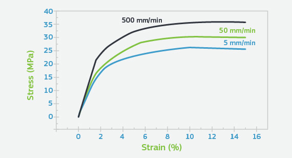 Some material properties are strain-rate dependent. The rate at which the material is loaded will have an influence on the modulus as well as the yield stress as is shown in Figure 3. Higher strain rates produce greater values for modulus and yield stress. While it is desirable for all suppliers of a given type of material to use the same strain rates when testing, this is not always the case and there can be apparent differences in data sheet properties caused by this lack of harmonization.