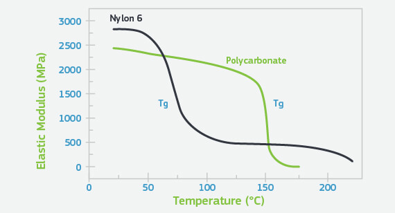These two materials represent behavior typical of their respective structures. Both possess a glass transition that represents the onset of molecular motion in the amorphous regions of the structure. In the amorphous polycarbonate this results in the complete loss of all useful mechanical properties over a relatively narrow temperature range. However, in the nylon the decline in modulus, while significant, is not catastrophic and about 20% of the room temperature performance remains. This is a measure of the contribution of the crystal structure in the polymer. All amorphous polymers exhibit temperature-dependent behavior that is similar to that of polycarbonate, and all semi-crystalline materials display a property-temperature profile that is similar to that of nylon. The essential differences are in the exact transition temperatures for each polymer.