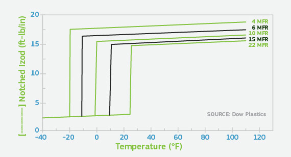 Impact properties are also influenced by temperature. Lower temperatures are more likely to produce brittle behavior in a material and the transition from ductile to brittle performance can be very sudden. It can be difficult to find a complete picture of this type of behavior because material suppliers are reluctant to report on unfavorable performance characteristics. However, a search can yield valuable results even if these results are not available for all materials. Figure 5 shows the notched Izod impact behavior for different grades of polycarbonate as a function of temperature. These results illustrate the rapid change from ductile to brittle behavior that typically occurs as a function of declining temperature. This graph also shows that the transition from ductile to brittle performance is related to the molecular weight of the polymer. The lower melt flow rate values are associated with grades having higher average molecular weights. This property has a significant influence on the temperature at which the impact performance changes.